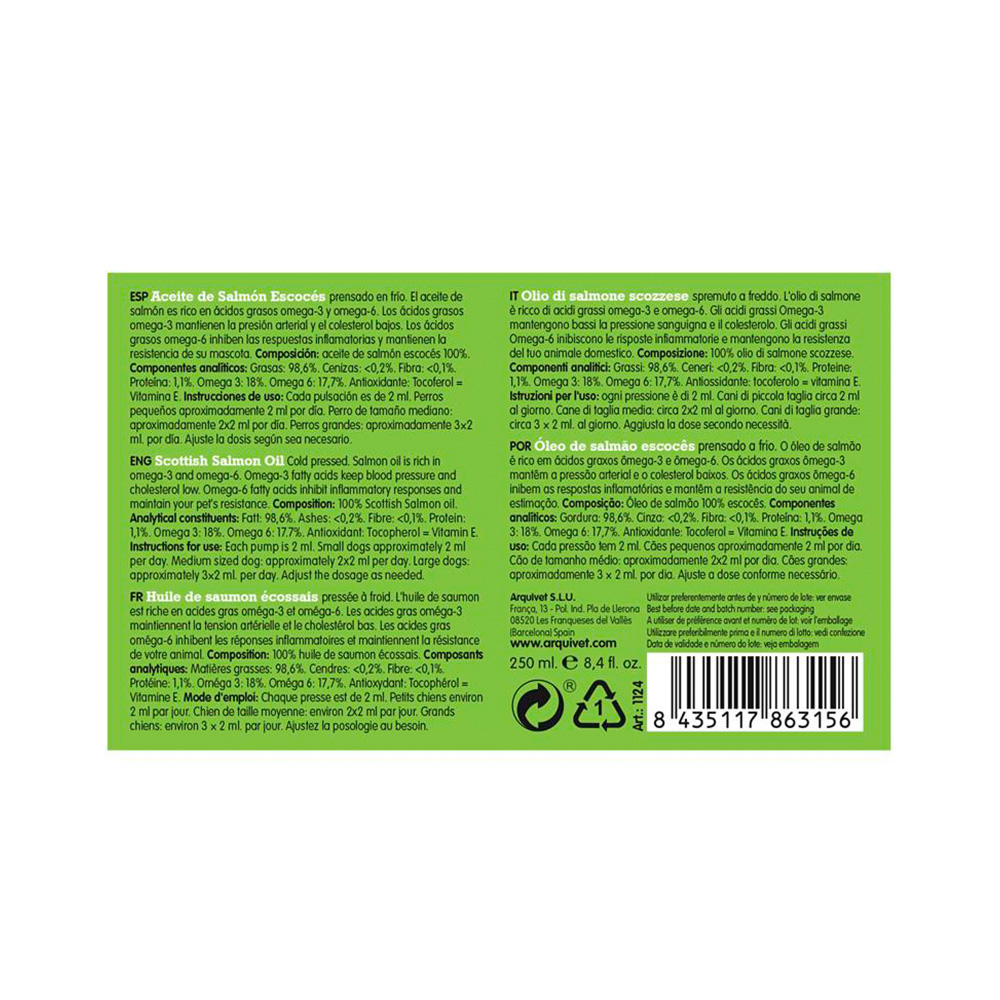 COMPOSICIÓN: aceite de salmón escocés 100%. Componentes analíticos: Grasas: 98,6%. Cenizas: <0,2%. Fibra: <0,1%. Proteína: 1,1%. Omega 3: 18%. Omega 6: 17,7%. Antioxidante: Tocoferol = Vitamina E.
