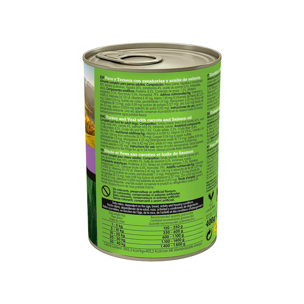 Composición: Pavo (carne, hígados y corazones) 62%, ternera (pulmones, hígado) 30%, zanahorias 4%, aceite de salmón 0,1%, minerales, xilosa.