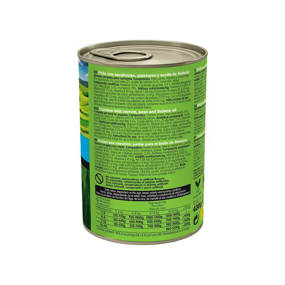 Composición: Pollo (carne, hígados y corazones) 91%, zanahorias 2%, guisantes 2%, aceite de salmón 0,1%, minerales, xilosa.