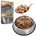 Belcando Topping pato con boniato es una deliciosa opción si a tu perro le encanta el sabor de la carne aderezado con un jugoso caldo con boniato. Una opción genial ya que lo que ves en el envoltorio es lo que encontrarás: trozos de pato y boniato que harán babear a tu fiel compañero.