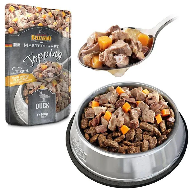 Belcando Topping pato con boniato puedes añadirlo como aderezo al pienso de tu perro cuando le cocinas en casa puré de patatas o arroz. Recuerda siempre que es un alimento complementario.