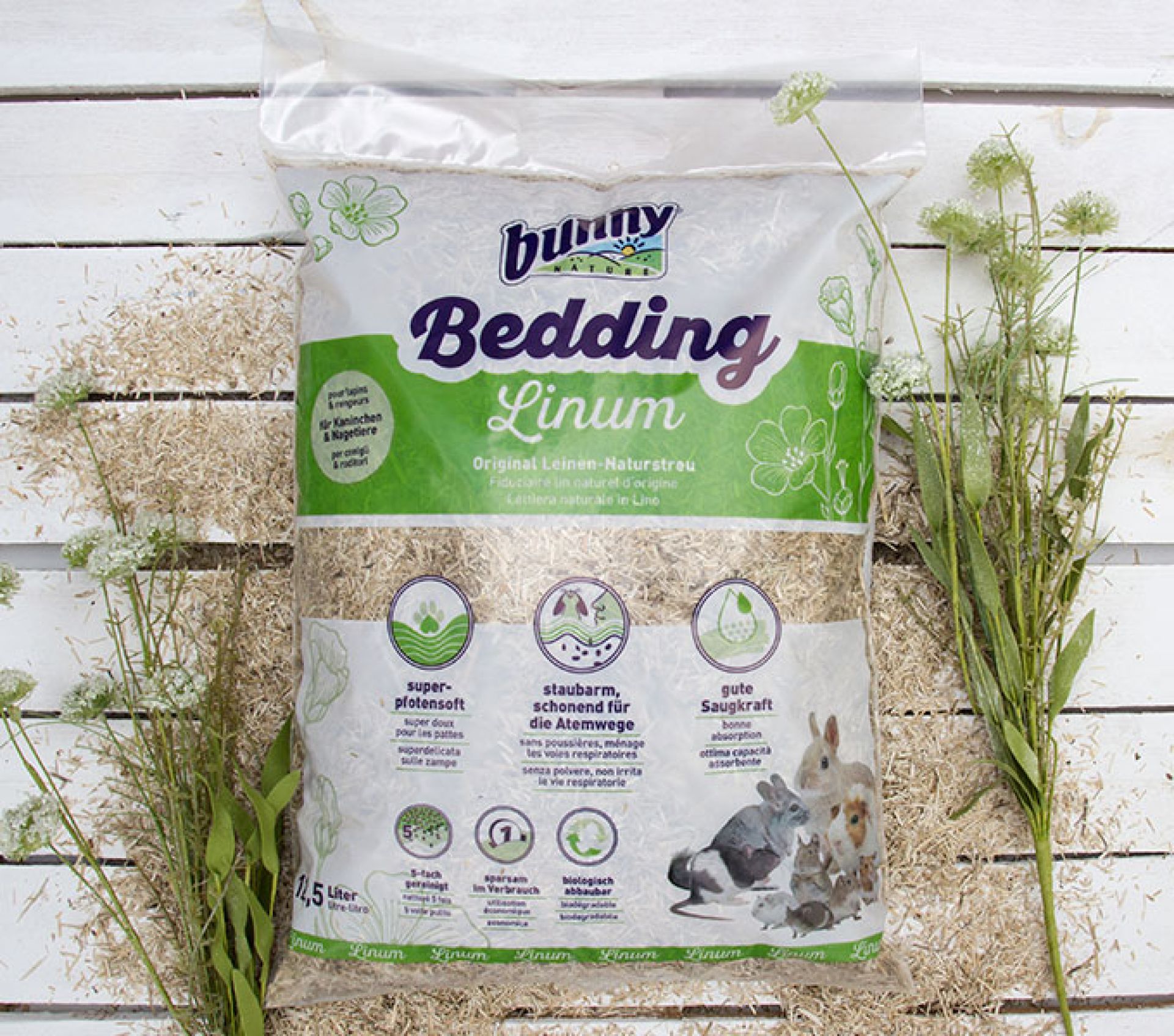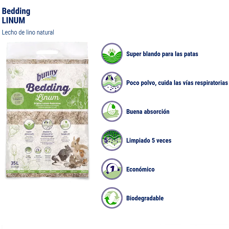 Uso: Una capa suelta de 5 a 8 cm Bunny Bedding de lino ofrece de inmediato a los animales un confort máximo y les proporciona una superficie placentera y seca para moverse y tumbarse. Cambie las zonas con orina y excrementos – si se da el caso – por nuevo Bunny Bedding Linum; ello ofrecerá tanto al dueño como a los animales varias semanas disfrutando de una jaula limpia. Según el tamaño de la jaula y de la cantidad de animales Bunny Bedding Linum permanecerá 14 días seco y con una fiabilidad atrapando el amoniaco.