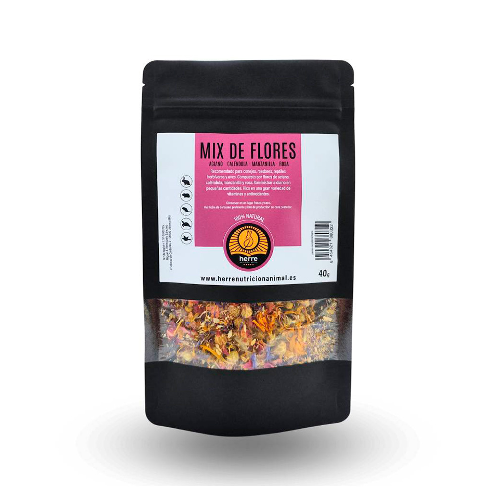 Ofrece a tus mascotas una mezcla única de flores naturales con nuestro Mix de Flores que incluye aciano, caléndula, manzanilla y rosa. Este complemento multivitamínico aporta una gran variedad de vitaminas y antioxidantes ideal para la salud y bienestar de conejos y roedores.