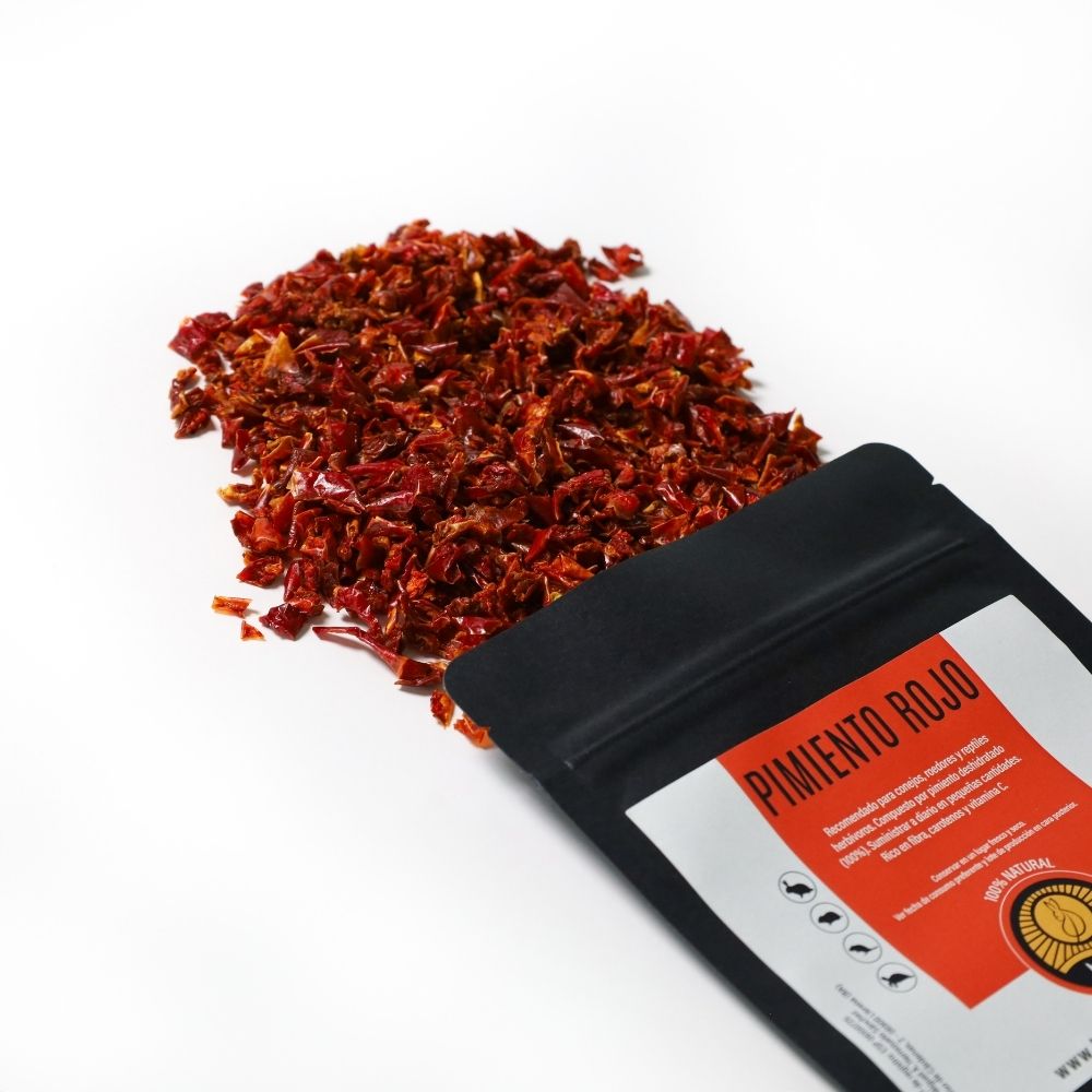 El formato de 100 gramos es ideal para conservar la frescura del producto y para ofrecer la cantidad diaria recomendada sin desperdicios. Este tamaño compacto facilita su almacenamiento y garantiza que cada porción mantenga sus propiedades nutricionales intactas. Además, al ser 100% natural, el pimiento rojo no contiene aditivos, conservantes ni ingredientes artificiales, asegurando un snack seguro y beneficioso para tus mascotas.
