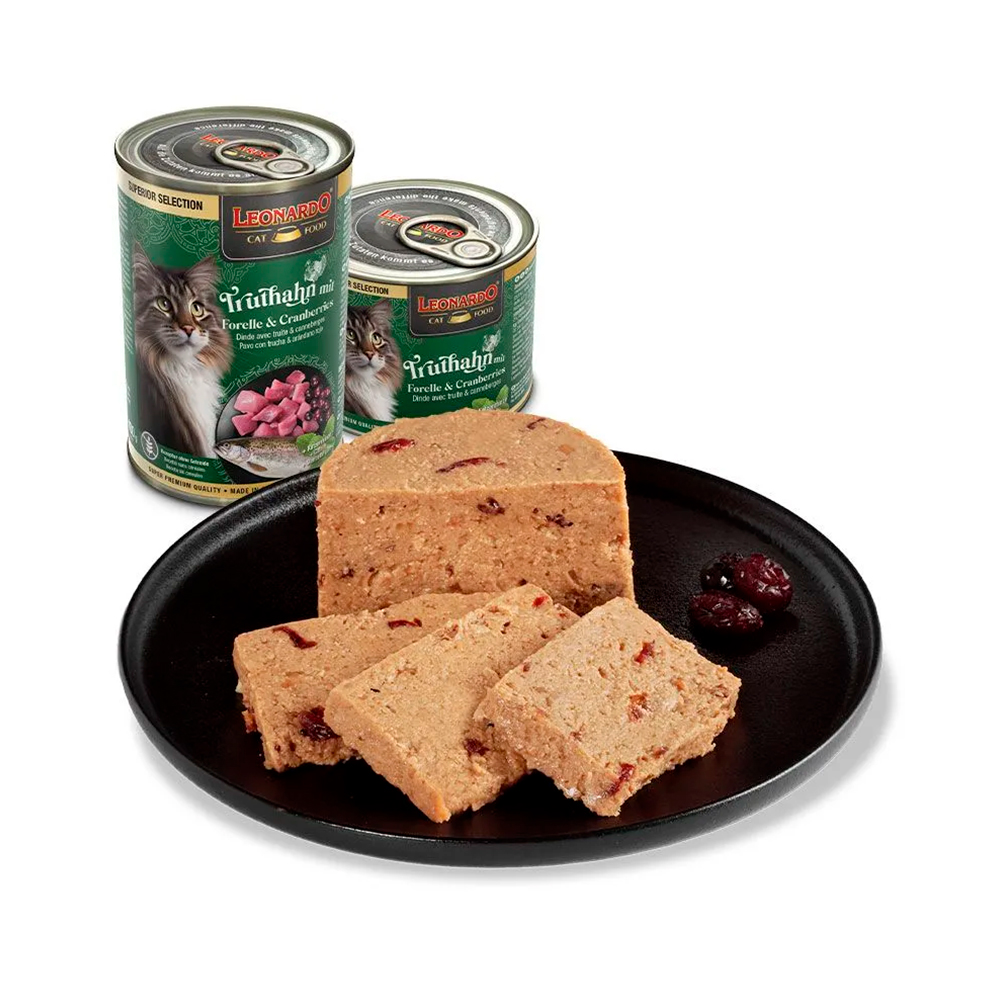 Carne, corazón, hígado y mollejas de pavo (40 %); caldo de pavo y trucha (28,8 %); trucha (26 %); arándanos rojos (4 %); minerales (0,5 %); cáscaras de huevo*¹ (0,5 %); aceite de salmón (0,1 %); menta gatuna*¹ (0,1 %) *¹secado