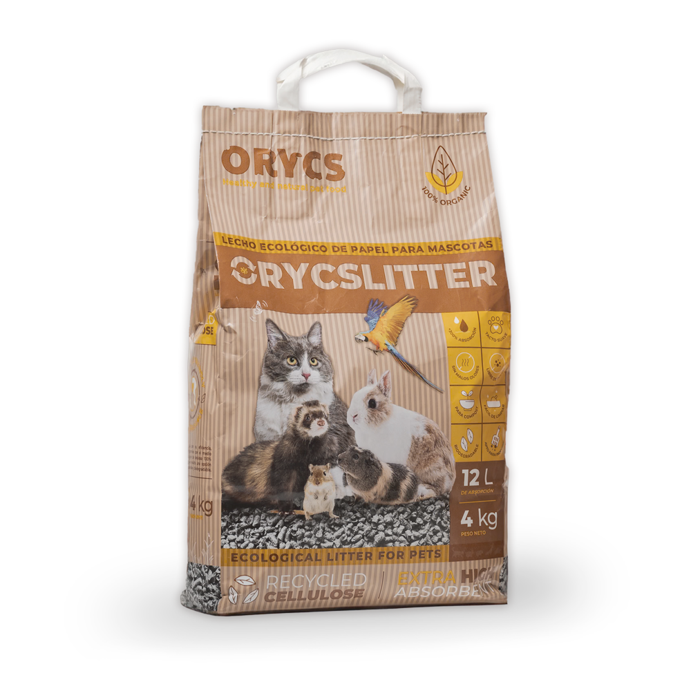 Orycslitter de Mini Orycs es un lecho de papel reciclado ecológico de alta densidad y rendimiento con una capacidad de adsorción de hasta un 300% de su peso manteniendo bien su estructura, con lo que se prolonga la vida útil del producto y se reduce la frecuencia de cambio. Además, al conservar su forma incluso mojado, es más cómodo para las patitas.