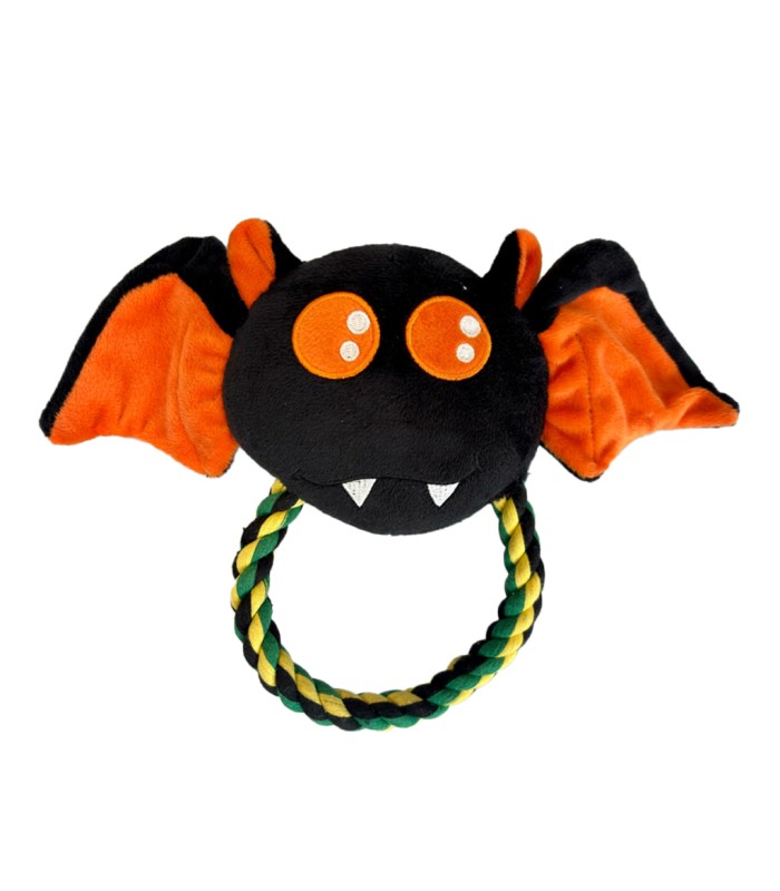 El Murciélago Tirador Naranja de la colección Doggy Masters es un juguete de peluche diseñado especialmente para perros que buscan diversión y entretenimiento seguro. Su cuerpo de peluche suave y resistente combina un atractivo color negro con alas naranjas, mientras que un aro de cuerda trenzada en tonos verde, negro y amarillo permite que tu perro juegue a tirar y morder de manera interactiva. Este aro no solo es divertido, sino que también ayuda a mantener la salud dental de tu mascota al reforzar la fuerza de la mordida y el cuidado de sus encías.