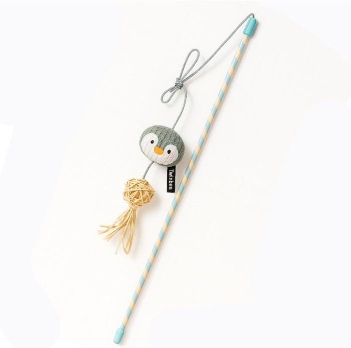 Caña de juego para gatos con muñeco pingüino de peluche y adorno inferior tipo bola/rafia que aporta movimiento. Aromatizada con catnip y silvervine (yerba gatera & matatabi) para despertar el instinto cazador y promover ejercicio divertido en casa.