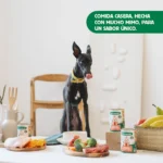 – Proporción de 50% pollo, 30% salmón, 10% ternera, 5% cerdo, 4% zanahoria y 1% guisantes.